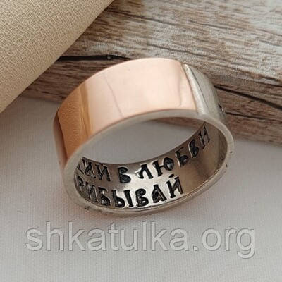 Обручка срібна із золотою напайкою і написом Прибывающий в любви в Боге прибывай всередині