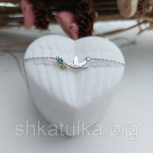 Срібне кольє з підвісом і фіанітами - оригінальна, ніжна і стильна прикраса. Його дизайн простий та універсальний, оскільки носити його можна з будь-яким видом одягу: діловий, кежуал, вечірній, стрітстайл. Кольє виготовлено у патріотичній стилістиці – голуб тримає два фіаніти, які символізують прапор України. Блакитний та жовтий фіаніти яскраво поблискують як у променях сонячного світла, так і при штучному освітленні. Кольє виготовлене зі срібла 925 проби, тому довго радуватиме вас своїм ідеальним зовнішнім виглядом. А доглядати прикраси зі срібла дуже просто, достатньо раз на місяць промити ювелірні вироби в мильній воді та просушити рушником.
