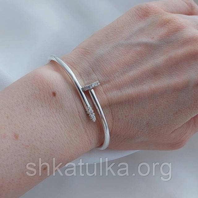 Жіночий срібний браслет на руку, стилізований під цвях - чудова прикраса, яка привнесе неповторність у ваш повсякденний образ. Срібний браслет витончено поєднує в собі стиль і оригінальність. Браслет виконаний зі срібла і має унікальний дизайн, стилізований під цвях. Капелюшок і кінчик браслета прикрашені маленькими білими фіанітами, які під час потрапляння на них світла красиво блищать і переливаються. Це надає браслету зі срібла неповторної привабливості. Цей незвичайний і стильний срібний браслет стане прекрасним доповненням до вашого повсякденного образу. Він підкреслить вашу індивідуальність та оригінальність, додавши нотку елегантності та шарму до вашого стилю. Будьте впевнені, що цей браслет приверне захоплені погляди. Оберіть цей жіночий срібний браслет на руку в стилі цвяха і додайте неповторності та блиску у свій образ. Виготовлений браслет зі срібла 925 проби, тому він довго залишатиметься таким ніби ви його щойно купили. Але все-таки мінімальний догляд необхідний, достатньо раз на місяць промити браслет зі срібла в мильній воді і просушити рушником.