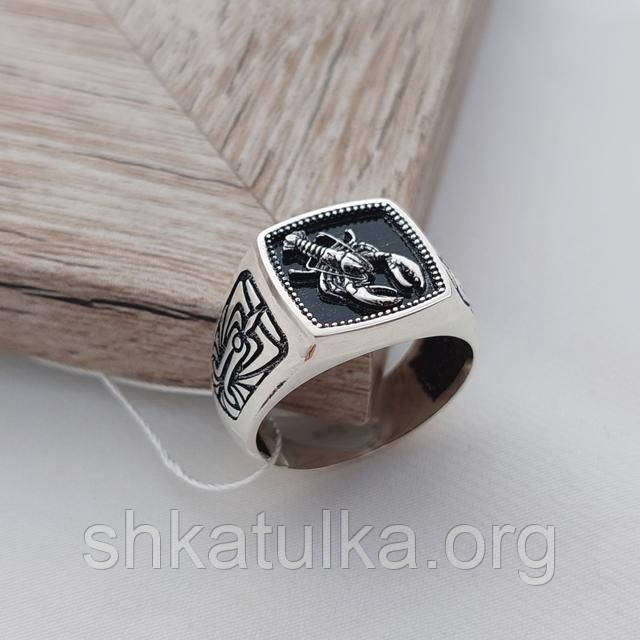 Печатка срібна чоловіча з чорною емаллю знак зодіаку Рак масивна