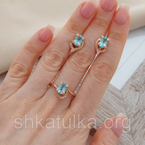 | Комплект золотого кільце та сережки з овальним блакитним кварцом 7.33 | Комплект золотого кільце та сережки з овальним блакитним кварцом 7.33 |