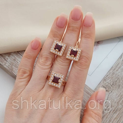Відправка з 02 грудня 2025Комплект золотий каблучка та сережки з квадратним гранатом і фіанітами 13.76