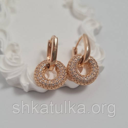 | Сережки золоті з підвісками та круглими білими фіанітами | Сережки золоті з підвісками та круглими білими фіанітами |