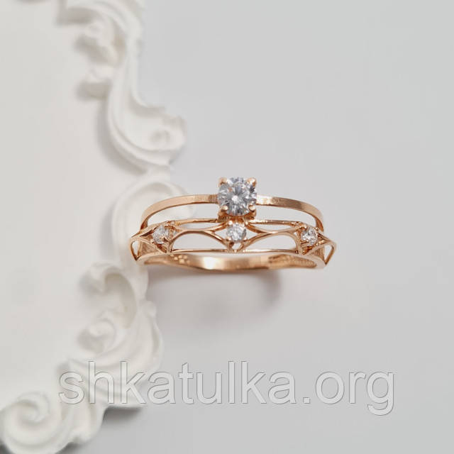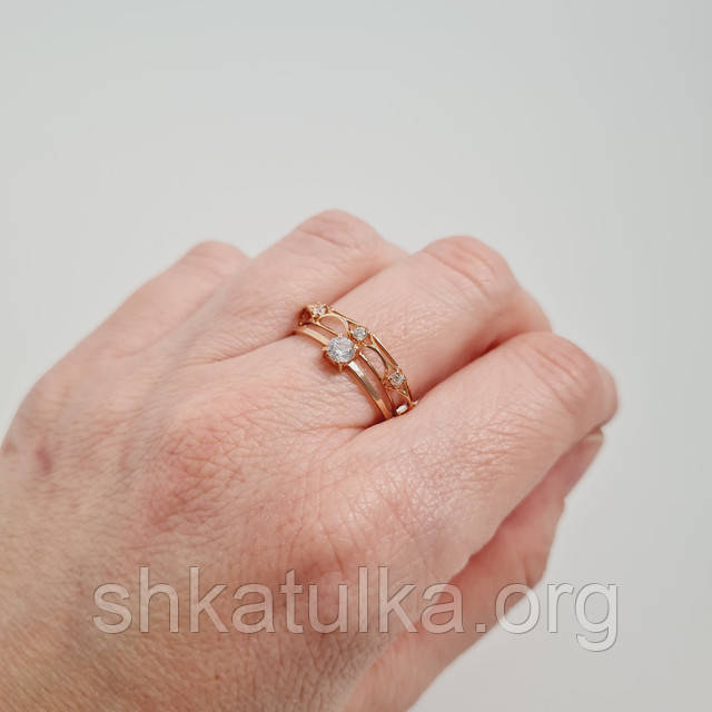 | Кільце із золота ажурне з білими круглими фіанітами різного розміру | Кільце із золота ажурне з білими круглими фіанітами різного розміру |