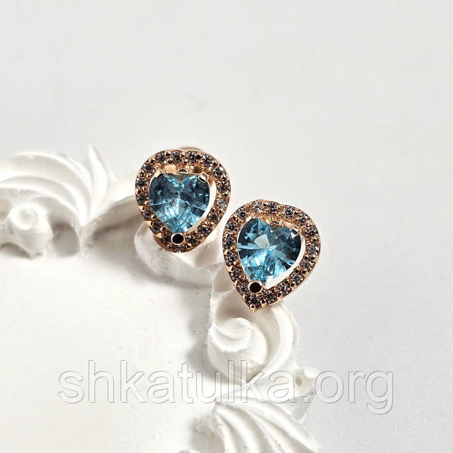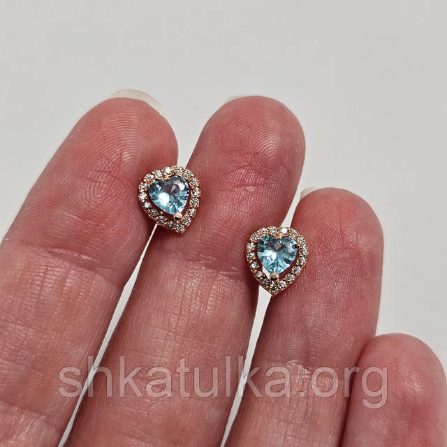 | Сережки гвоздики золоті з блакитними фіанітами серцями та білими круглими фіанітами | Сережки гвоздики золоті з блакитними фіанітами серцями та білими круглими фіанітами |
