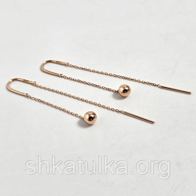 | Сережки протяжки золоті з підвісками золотими намистинами на ланцюжках без каменів | Сережки протяжки золоті з підвісками золотими намистинами на ланцюжках без каменів |