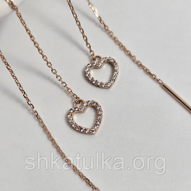 | Сережки протяжки золоті з підвісками сердечками та білими круглими фіанітами | Сережки протяжки золоті з підвісками сердечками та білими круглими фіанітами |