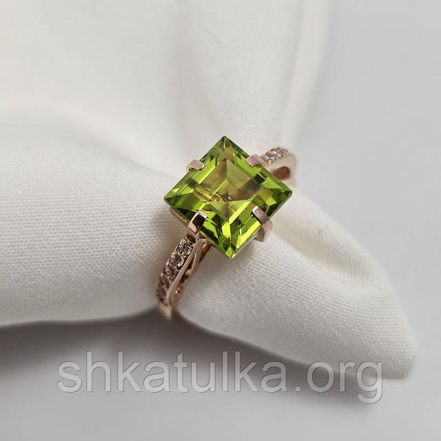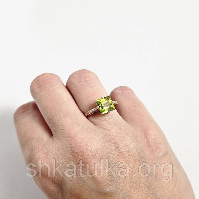 Золоте кільце з зеленим хризолітом і фіанітами 17