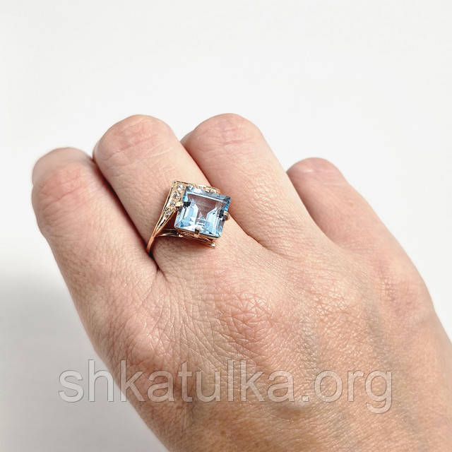 з топазом і фіанітами 1-2434т-з-П-11 18.5 4.98 — це витончена прикраса, в якій класична форма поєднується з яскравою кольоровою гамою і грою світла. У центрі композиції розташований квадратний топаз небесно-блакитного відтінку, який символізує чистоту, чесність і внутрішню гармонію. Його прозора глибина немов зберігає в собі подих океану і безкрає небо, створюючи відчуття легкості і спокою. Золото ідеально контрастує з блакиттю каменю, роблячи каблучку особливо виразною і благородною. Акцент на центральному елементі доповнений вишуканими деталями: над топазом розташовані маленькі білі фіаніти круглої огранки, які надають каблучці м'яке сяйво і підсилюють загальний блиск композиції. Каблучка із золота з топазом і фіанітами 1-2434т-з-П-11 18.5 4.98 підійде як для повсякденного носіння, так і для урочистих випадків. Воно органічно впишеться в образ з легкою сукнею, діловим костюмом або вечірнім вбранням. Завдяки своїй гармонійній формі і яскравому центральному акценту каблучка підкреслить витончений смак своєї власниці і стане родзинкою в її ювелірній колекції. Кожен камінь в цьому кільці виблискує при попаданні світла, створюючи ефект легкого мерехтіння. Таке оформлення надає виробу динаміку і жвавість — кільце виглядає по-різному в залежності від освітлення і кута огляду. Це робить прикрасу не тільки ефектною, але і універсальною. Золота каблучка має такі розміри: 15, 15,5, 16, 16,5, 17, 17,5, 18, 18,5, 19, 19,5, 20, 20,5, 21. Доглядати за каблучкою із золота дуже просто, достатньо періодично протирати її шматочком фланелі або мікрофібри. Вага каменя 1.062 гр.