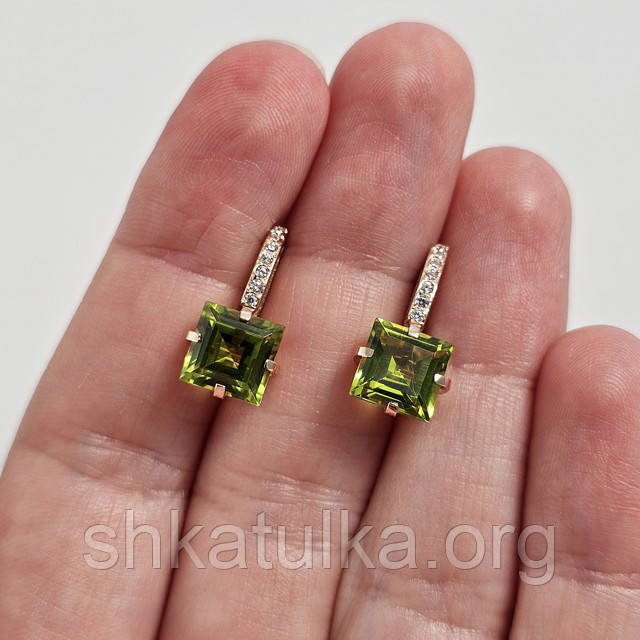 | Сережки золоті з хризолітом і білими каменями фіаніту | Сережки золоті з хризолітом і білими каменями фіаніту |