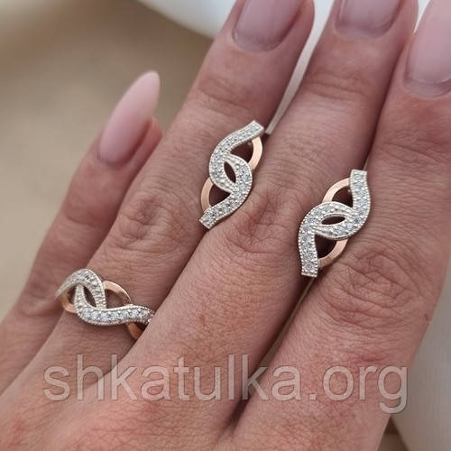 Оригінальний срібний із золотими пластинами та цирконами гарнітур, що складається з кільця та сережок, чудово доповнить ваше повсякденне або святкове вбрання. Цікавий дизайн ювелірного гарнітура зі срібла та золота приверне увагу оточуючих. Розсип цирконів на срібній основі у переплетенні із золотими елементами створюють незвичайний та красивий візерунок. Завдяки великій кількості та ограновуванні цирконів вони красиво мерехтять при попаданні на них світла. Срібні сережки не тільки красиво виглядають на вушках, але ще й надійно в них триматися завдяки англійському замку. Виготовлені красиві каблучки та сережки зі срібла 925 проби та із золота 375 проби. Догляд за таким комплектом ювелірних прикрас дуже простий – раз на місяць промивайте його в мильній воді та просушуйте рушником і він радуватиме вас дуже довго своїм блиском та сяйвом.