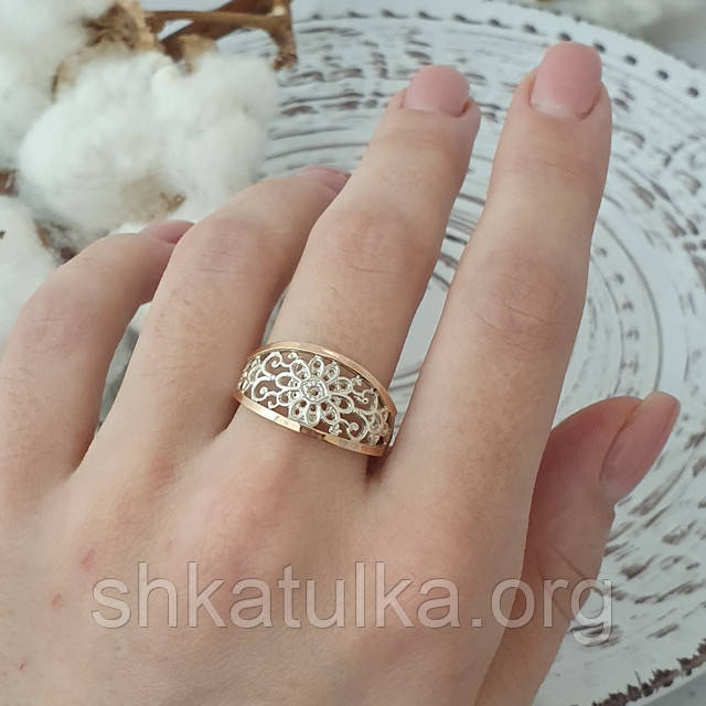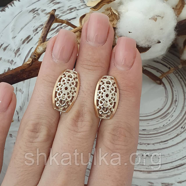 Незвичайний масивний срібний комплект із золотими пластинами сподобається дівчатам, які люблять великі прикраси, що виділяються. Оригінальна форма і малюнок надає прикрас свою унікальність і якусь незвичайність. Срібний ажурний орнамент у вигляді квітів розташований між двома золотими пластинами. Срібне із золотом масивне кільце доповнюють такі ж сережки, комплект стане чудовим доповненням до будь-якого вашого образу, будь то строгий офісний костюм або романтичне плаття шифону. Цей срібний комплект з виготовлений зі срібла 925 проби та золота 375 проби. А значить, такі ювелірні прикраси будуть дуже довго виглядати, так ніби ви тільки що їх купили. Але не забувайте про правильний догляд за прикрасами зі срібла. Наприклад, намагайтеся знімати гарнітур під час взаємодії з водою чи хімічними речовинами. І раз на місяць промивайте його у мильній воді.