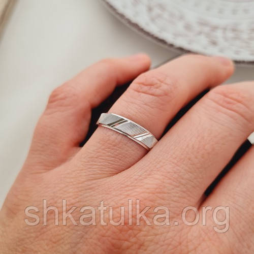 Обручка срібна ОС-3523-ЮДК стане не тільки прикрасою, а й символом вічного зв'язку і міцного союзу. Його незвичайний дизайн з геометричним орнаментом по всій поверхні привносить сучасний акцент в традиційний образ обручки. Рельєфні візерунки, що чергуються з гладкими смугами, створюють цікавий візуальний ефект, який переливається при кожному русі. Цей декоративний елемент надає каблучці особливої витонченості та стилю, роблячи її по-справжньому унікальною і такою, що запам'ятовується. Срібло, що символізує чистоту і щирість, додає каблучці глибокого сенсу. Цей благородний метал, як і почуття, витримує випробування часом, зберігаючи блиск і красу. Срібна обручка ОС-3523-ЮДК прекрасно підкреслить особливість вашого весілля, стане його родзинкою і слугуватиме незмінним нагадуванням про значущий день. Завдяки універсальному дизайну, каблучка має гармонійний вигляд як на жіночій, так і на чоловічій руці, відбиваючи рівність і взаємну повагу у стосунках. Обручка зі срібла має такі розміри 15, 15,5, 16, 16,5, 17, 17,5, 18, 18,5, 19, 19,5, 20, 20,5, 21. Обручка виготовлена зі срібла 925 проби, вона зберігатиме свій первинний зовнішній вигляд тривалий час, не темнітиме, не тьмянітиме, достатньо один раз на місяць промивати в мильній воді та просушувати рушником. Вартість обручки залежить від її ваги. Наші менеджери з радістю допоможуть вам підібрати розмір і прорахувати ціну на обручку.